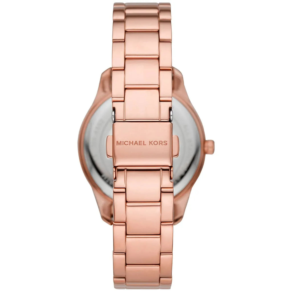layton three hand red dial rose gold steel strap watch for women - mk6893
