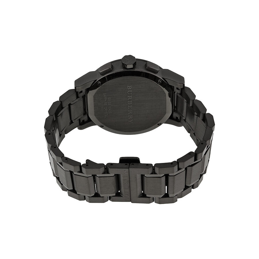 Dark grey ion-plated stainless steel case and bracelet. Fixed dark grey ion-plated bezel. Blue dial with luminous grey hands and index hour markers. Minute markers around the outer rim. Dial Type: Analog. Luminescent hands and markers. Date display at the 4 o'clock position. Chronograph - three sub-dials displaying: 60 second, 30 minute and 12 hour. Quartz movement. Scratch resistant mineral crystal. Solid case back. Case diameter: 42 mm. Round case shape. Butterfly deployment clasp. Water resistant at 50 meters / 165 feet. Functions: chronograph, date, hour, minute, second. Casual watch style. Burberry Chronograph Blue Dial Dark Grey Ion-plated Men's Watch BU9365.