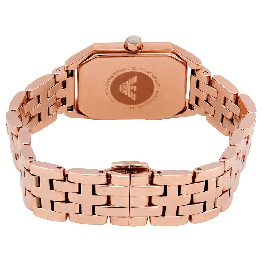 Rose gold PVD stainless steel case and bracelet. Fixed rose gold PVD bezel. White mother of pearl dial with rose gold-tone hands. Index markers appear at the 3, 6 and 9 o'clock positions. The Emporio Armani Eagle appears at the 12 o'clock position. Dial Type: Analog. Quartz movement. Scratch resistant mineral crystal. Pull / push crown. Solid case back. Rectangle case shape. Case dimensions: 24 mm x 36 mm. Case thickness: 6 mm. Band width: 14 mm. Butterfly deployment clasp. Water resistant at 30 meters / 100 feet. Functions: hour, minute. Giola Series. Casual watch style. Watch label: Japan Movt. Armani Giola Quartz White Mother of Pearl Dial Ladies Watch AR11147.