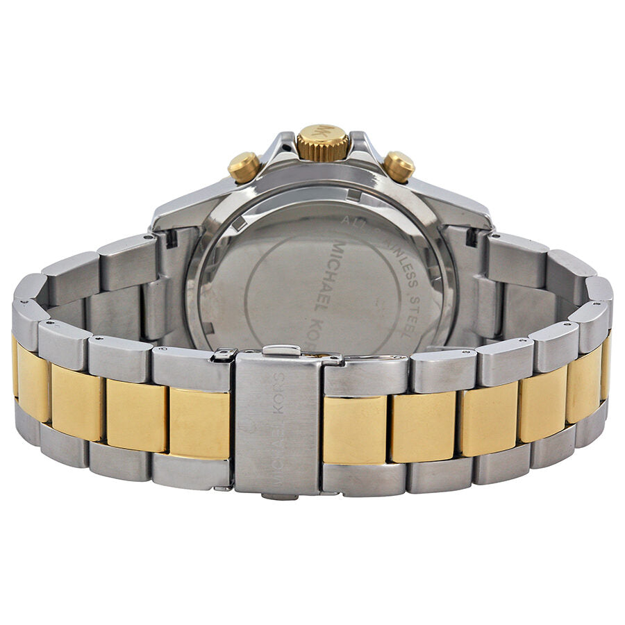 Stainless steel case with a two-tone (silver and gold-tone) stainless steel bracelet. Fixed gold-tone bezel with black top ring. Black dial with luminous hands and dot hour markers. Minute markers around the outer rim. Dial Type: Analog. Luminescent hands and markers. Date display between 4 and 5 o'clock positions. Chronograph - three sub-dials displaying: 60 second, 60 minute and 24 hour. Quartz movement. Scratch resistant mineral crystal. Solid case back. Case diameter: 45 mm. Case thickness: 12.5 mm. Round case shape. Band width: 20 mm. Fold over clasp with double push button release. Water resistant at 50 meters / 165 feet. Functions: chronograph, date, hour, minute, second. Casual watch style. Michael Kors Everest Oversized Chronograph Black Dial Two-tone Men's Watch MK8311.