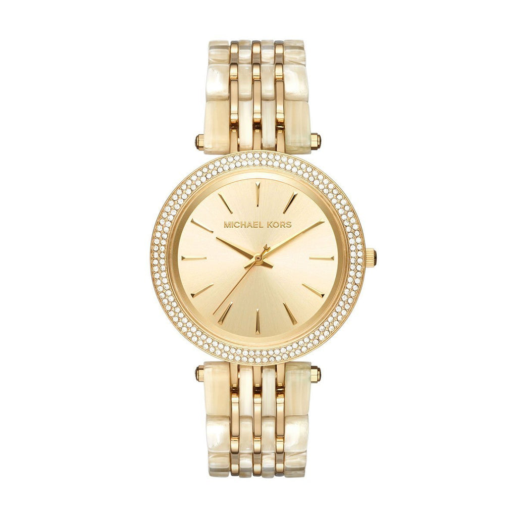 This Michael Kors Darci Gold-tone Dial Ladies Watch MK4325 comes in 39-mm stainless steel case with mineral dial window refined Gold-Tone watch featuring a Three Hand movement Analog-quartz Movement Case Diameter: 39mm Water Resistant To 50m (165ft: in General, Suitable for Short Periods Of Recreational Swimming, but not Diving or Snorkeling