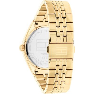 The Tommy Hilfiger 1782592 Monica watch has a 38mm round gold stainless steel case with a gold dial. It is paired with a matching gold bracelet and deployment clasp.