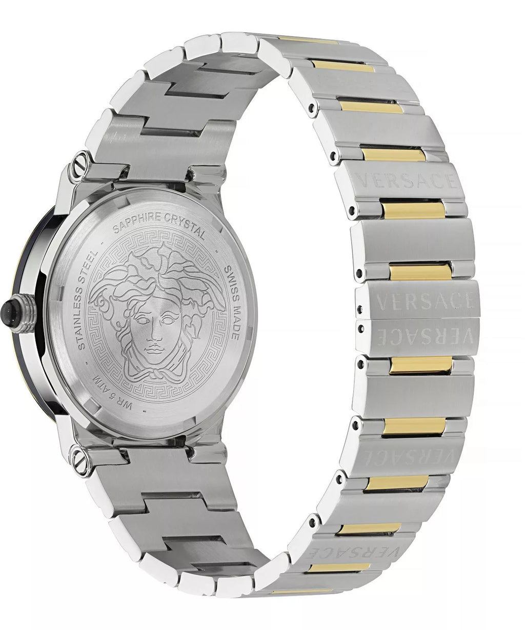 The Versace VE7G00223 Greca Logo Moonphase watch has a 38mm round multicolour stainless steel case with a blue dial. It is complemented by a two-tone bracelet and butterfly clasp.