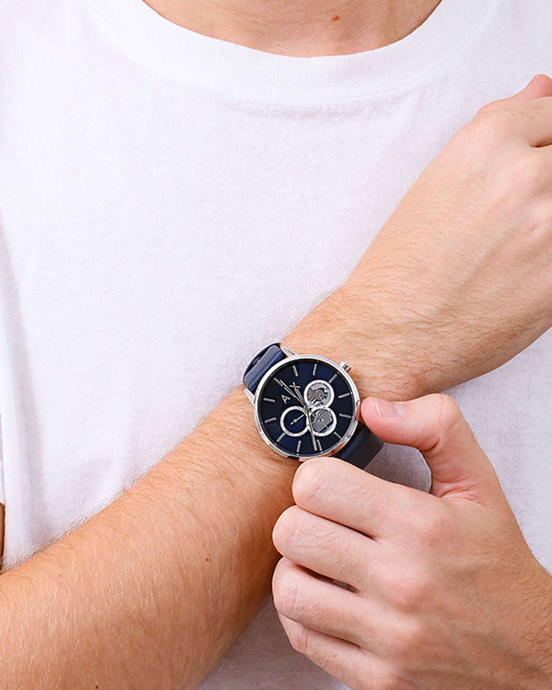 An Armani Exchange AX2746 watch for men, with a 42mm round silver stainless steel case, a blue dial, and a blue band. It operates on a quartz movement.